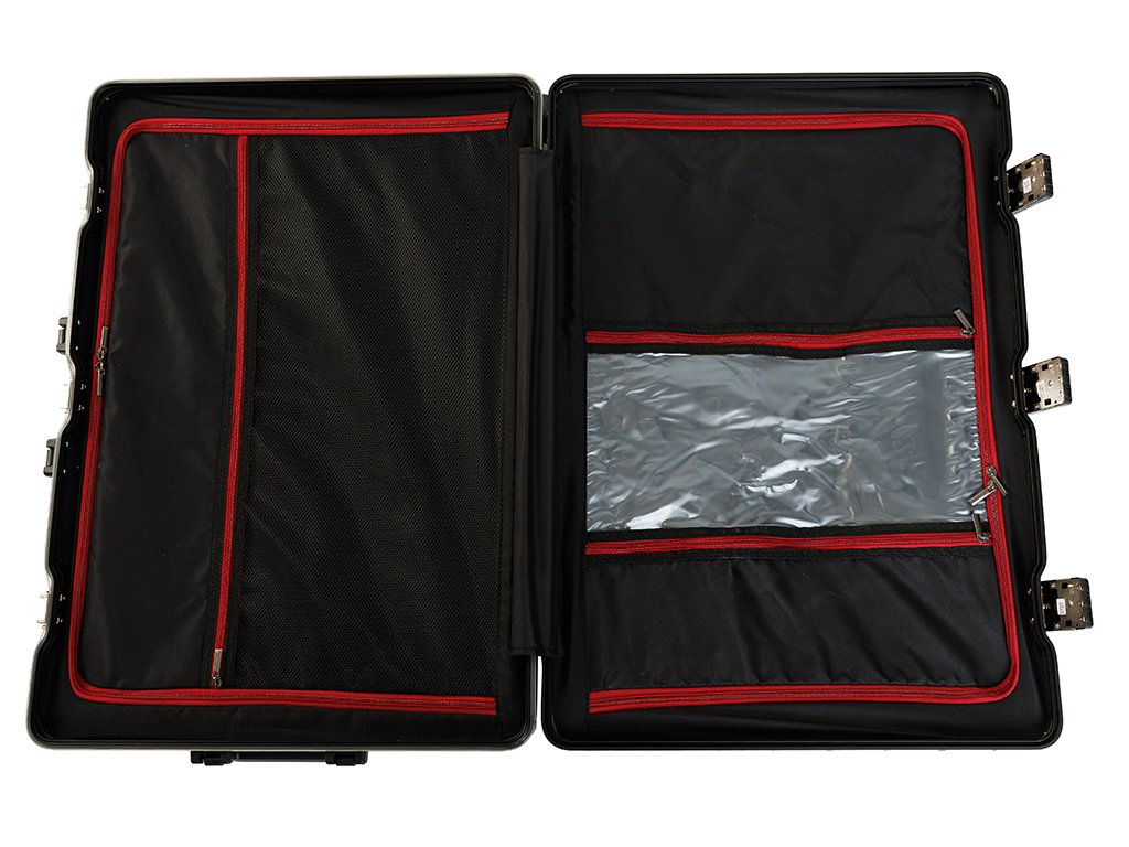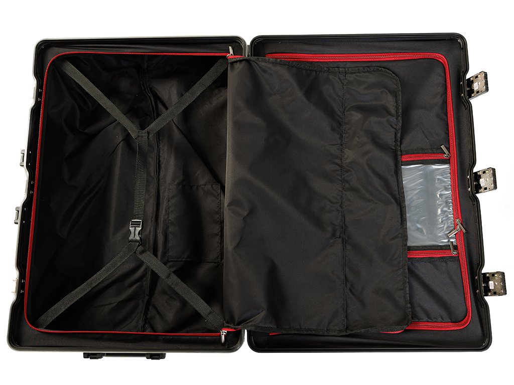 - uvnitř kufru stylová podšívka, 2 kapsy na zip a elastické popruhy pro upevnění oblečení a předmětů