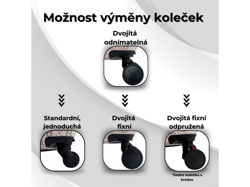 - 4 otočná dvojitá odnímatelná kolečka, kufr je určen pro manipulaci na všech 4 kolečkách!