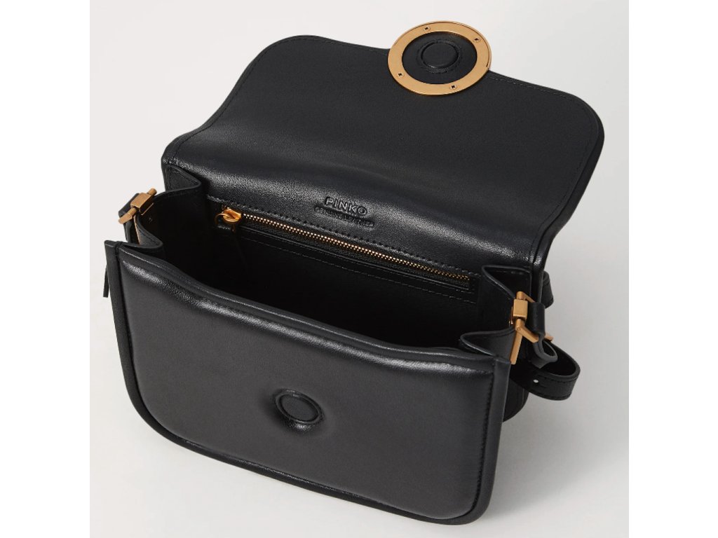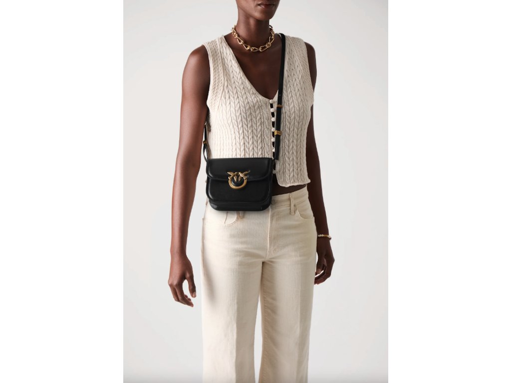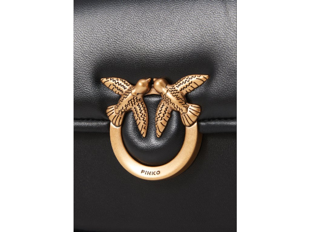 Luxusní kabelka černé barvy od oblíbené italské značky Pinko je z koženého materiálu zdobena ikonickým zlatým kovovým detailem v podobě dvou ptáčků a elegantním prošíváním. Uvnitř má kabelka jednu komoru, kde vevnitř komory naleznete malou kapsičku na zip. Hlavní zapínání kabelky je na magnetický kovový druk. Součástí je kožený nastavitelný popruh a prachový pytlík. Ideální doplněk pro každý stylový outfit, který kombinuje eleganci a praktičnost.
