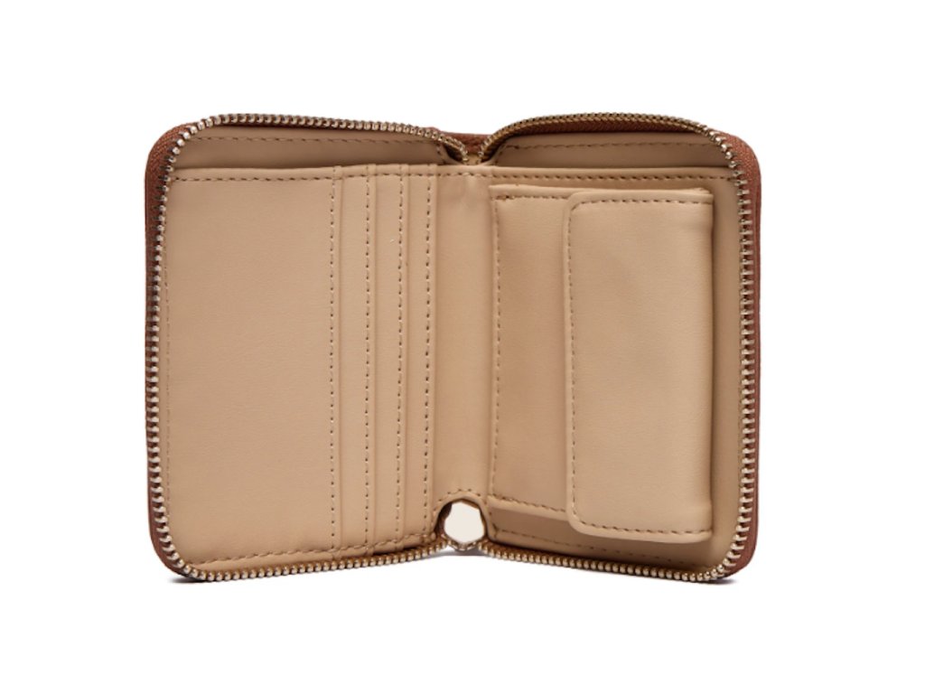 Luxusní malá dámská peněženka oblíbené značky GUESS je v hnědé barvě s logem značky ve zlatém tónu. Uvnitř má peněženka několik přihrádek na karty, bankovky a kapsu na mince uzavíratelnou kovovým drukem.