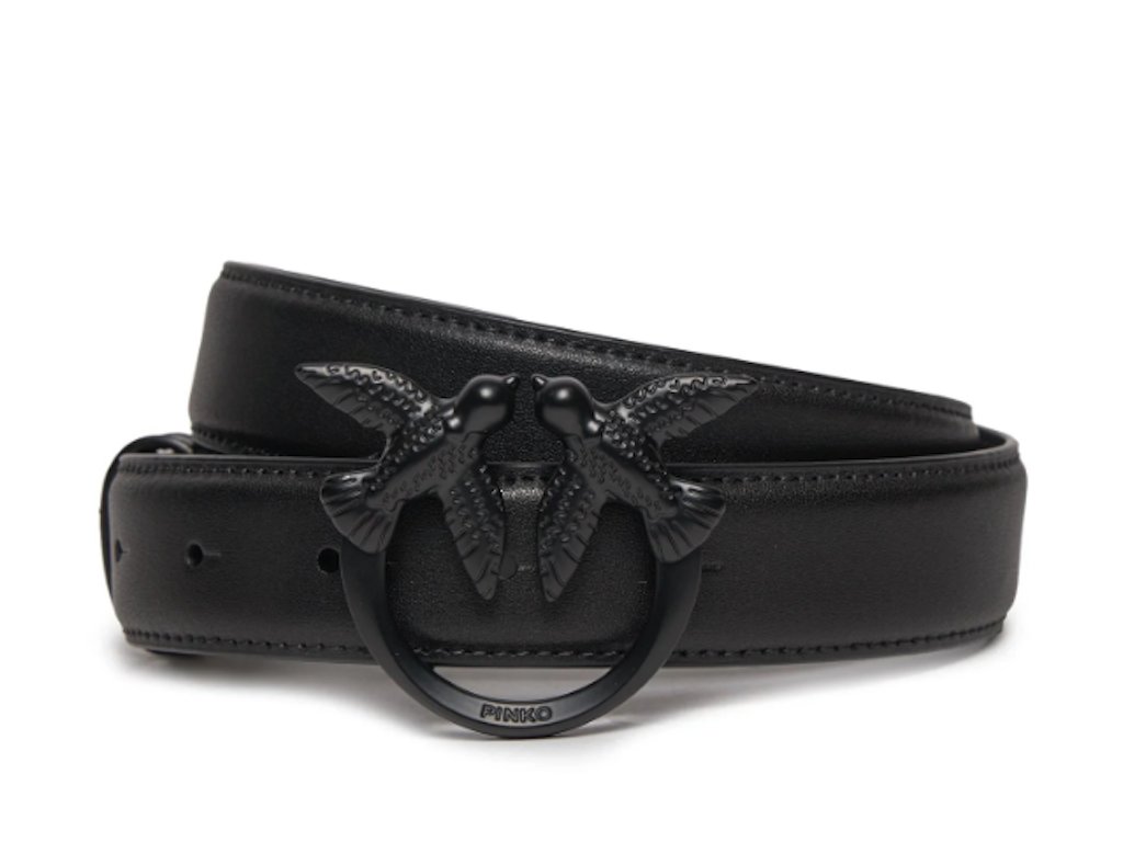 Dámský kožený pásek luxusní italské značky PINKO černé barvy. Sponu opasku zdobí logo a znak letících ptáků, který je pro tuto značku typický. Kování je ve černém tónu. Pásek PINKO se hodí na každou příležitost, díky svému nadčasovému designu. Prachový pytlík je součástí.