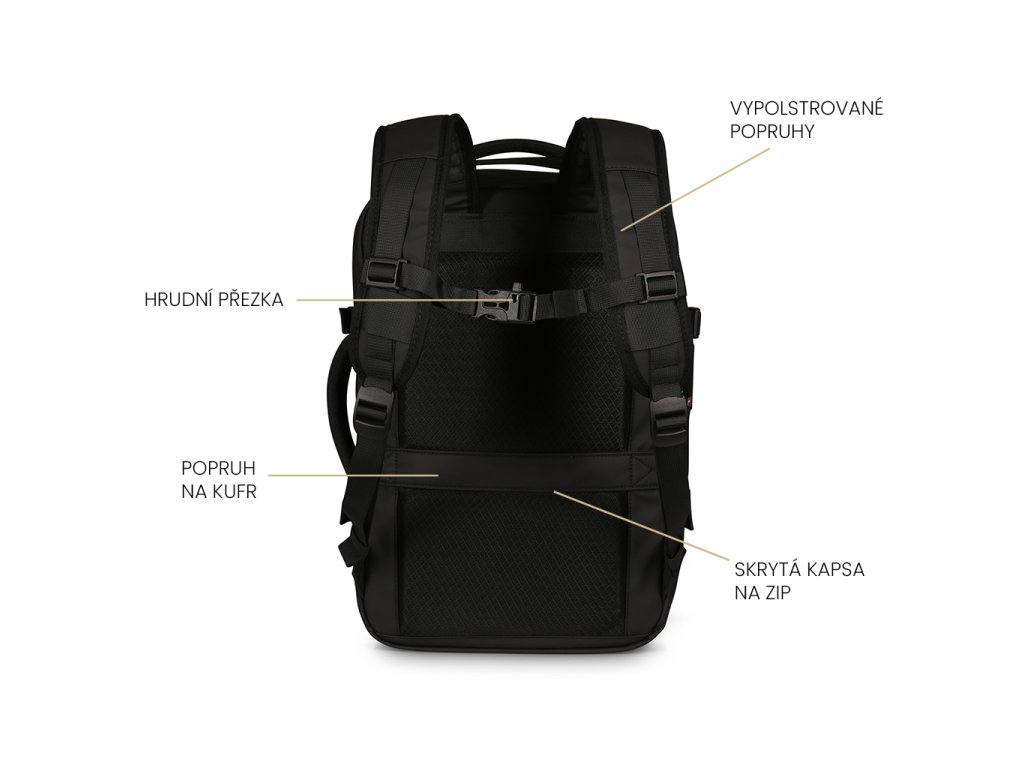 - Ergonomické nošení – polstrované popruhy a zádová část, možnost uchycení na kufr.