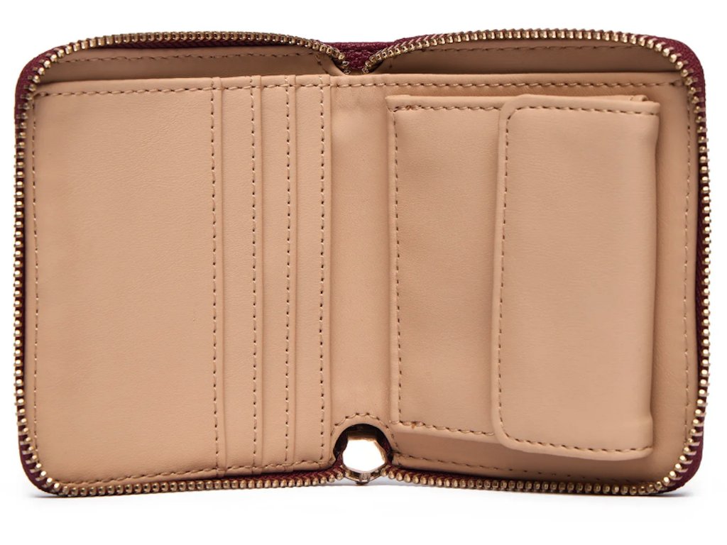 Stylová malá peněženka v elegantní bordó barvě značky Guess. Model je vybaven praktickým zipem, který zajistí bezpečnost vašich cenností. Vnitřní část nabízí prostor pro bankovky, karty a drobné kapsu na drobné mince se zapínáním na druk. Minimalistický design a kvalitní materiály dodávají peněžence nadčasový vzhled. Zdobená je logem značky GUESS.