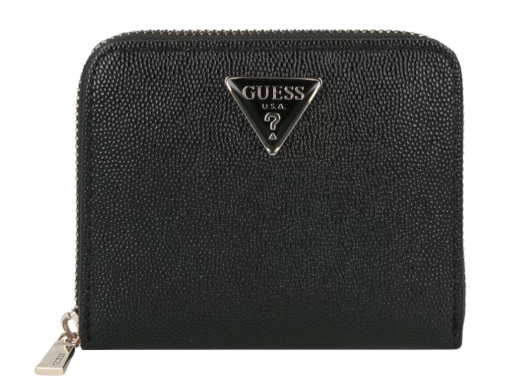 Malá dámská peněženka oblíbené značky GUESS je v černé barvě s logem značky ve zlatém tónu. Uvnitř má peněženka 4 přihrádky na karty, přihrádku na bankovky a kapsu na mince uzavíratelnou kovovým drukem.