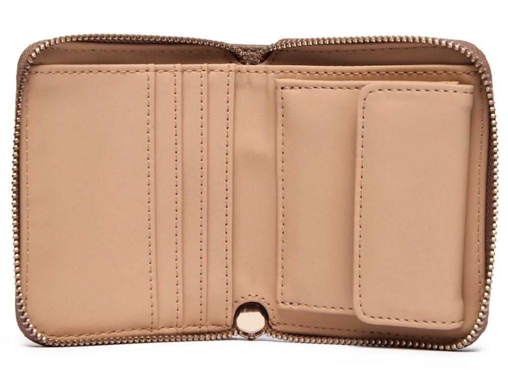 Buďte organizovaní a stylový s malou peněženkou značky Guess. Dámská peněženka v praktické velikosti značky Guess je hnědé barvy se vzorem značky loga Guess. Peněženka se zapíná na zip a uvnitř je menší kapsa na drobné mince se zapínáním na druk. Součástí jsou i přihrádky na karty. Kování je ve zlaté barvě, součástí je originální krabička.
