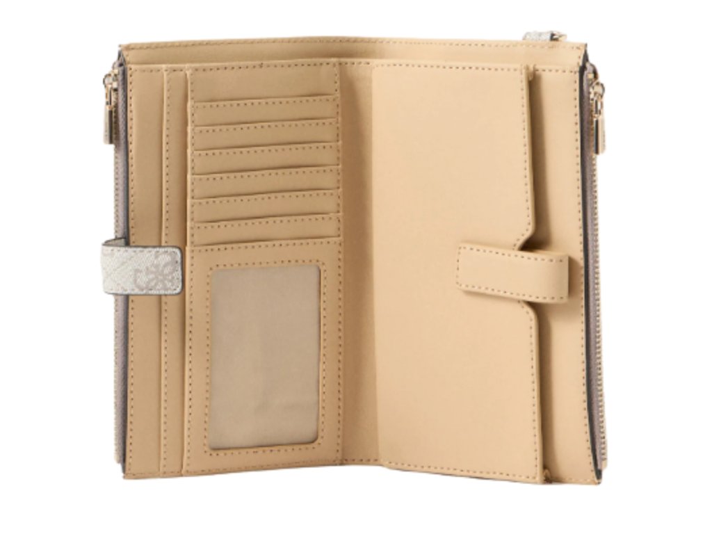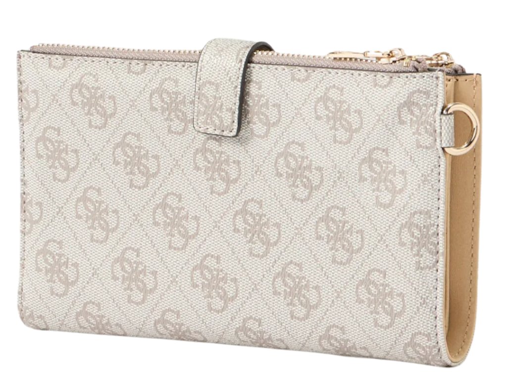 Dámská luxusní peněženka značky Guess je v šedé barvě se zlatým logem značky. Peněženka má dvě komory, které jsou na zip. Uvnitř najdeme přihrádku na bankovky několik přihrádek na karty a také kapsu na drobné mince se zapínáním na zip a také poutko na boční straně. Peněženka je ideální pro každodenní nošení.